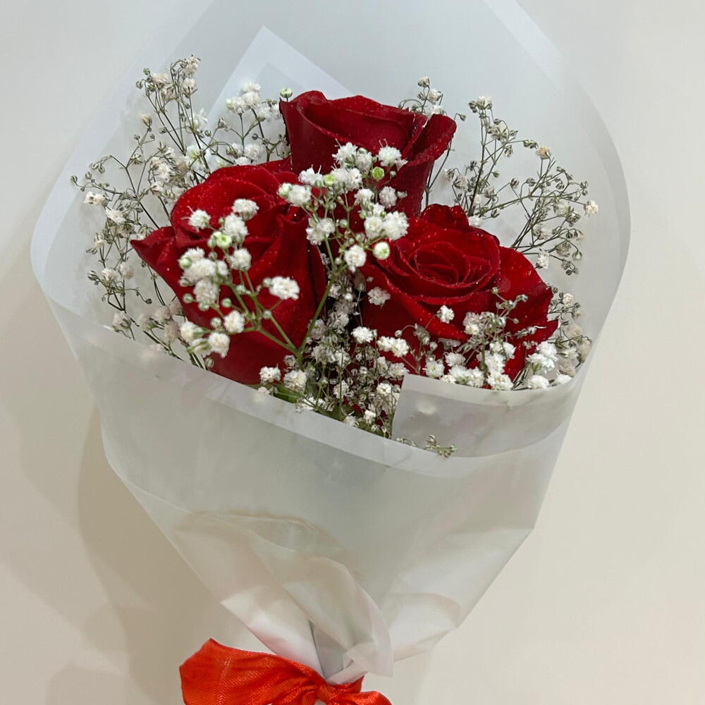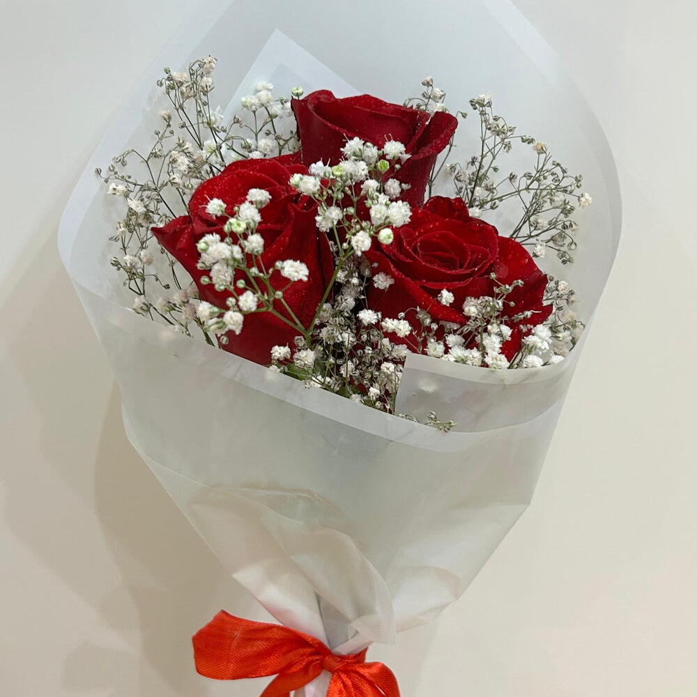 Романтический букет из 3 премиальных красных роз с нежной гипсофилой, элегантно упакованный в белую бумагу. Идеально подходит для выражения любви, благодарности или в качестве приятного сюрприза для особенного человека.