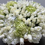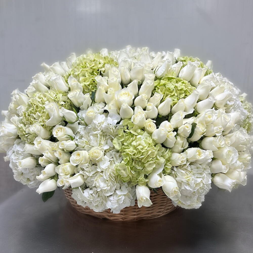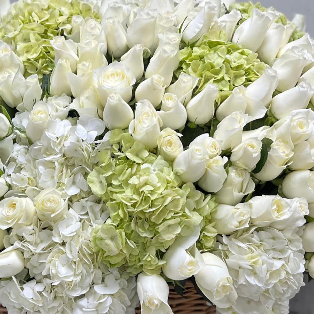 big basket - 1 шт. mix of white and green hydrangeas - 30 шт. white rose proud - 350 шт.
