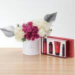 белые гортензии - 2 шт. ветки эвкалипта - 3 шт. розовые розы Джульетты - 5 шт. серебристая сухая пальма - 2 шт. небольшой подарочный набор The Rituals of Ayurveda - 1 шт.