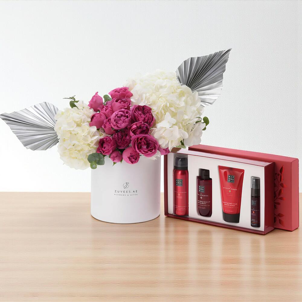 белые гортензии - 2 шт. ветки эвкалипта - 3 шт. розовые розы Джульетты - 5 шт. серебристая сухая пальма - 2 шт. небольшой подарочный набор The Rituals of Ayurveda - 1 шт.