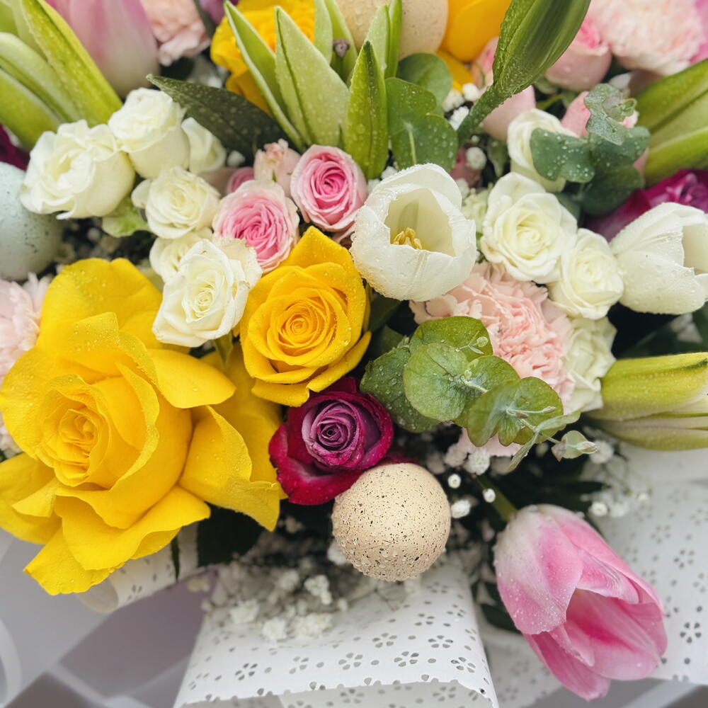 Отпразднуйте Пасху с нашим элегантным букетом ручной работы, в состав которого входят 2 белые лилии, 3 белых тюльпана, 3 розовых тюльпана, 4 фиолетовые розы, 4 желтые розы, 2 розовые кустовые розы, 2 белые кустовые розы, 4 розовые гвоздики, свежий эвкалипт, нежная гипсофила и 4 декоративных пасхальных яйца. Букет красиво упакован в высококачественную белую пленку с мягкой бумагой для роскошного весеннего завершения — идеально подходит для подарка, украшения дома или добавления праздничного настроения к вашему пасхальному торжеству. 🌸🐣✨