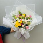 Отпразднуйте Пасху с нашим элегантным букетом ручной работы, в состав которого входят 2 белые лилии, 3 белых тюльпана, 3 розовых тюльпана, 4 фиолетовые розы, 4 желтые розы, 2 розовые кустовые розы, 2 белые кустовые розы, 4 розовые гвоздики, свежий эвкалипт, нежная гипсофила и 4 декоративных пасхальных яйца. Букет красиво упакован в высококачественную белую пленку с мягкой бумагой для роскошного весеннего завершения — идеально подходит для подарка, украшения дома или добавления праздничного настроения к вашему пасхальному торжеству. 🌸🐣✨