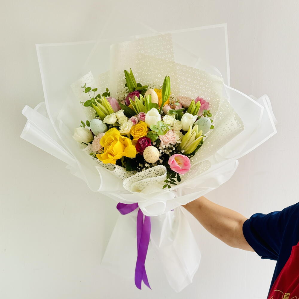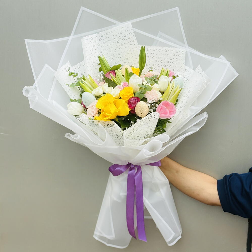 Отпразднуйте Пасху с нашим элегантным букетом ручной работы, в состав которого входят 2 белые лилии, 3 белых тюльпана, 3 розовых тюльпана, 4 фиолетовые розы, 4 желтые розы, 2 розовые кустовые розы, 2 белые кустовые розы, 4 розовые гвоздики, свежий эвкалипт, нежная гипсофила и 4 декоративных пасхальных яйца. Букет красиво упакован в высококачественную белую пленку с мягкой бумагой для роскошного весеннего завершения — идеально подходит для подарка, украшения дома или добавления праздничного настроения к вашему пасхальному торжеству. 🌸🐣✨