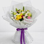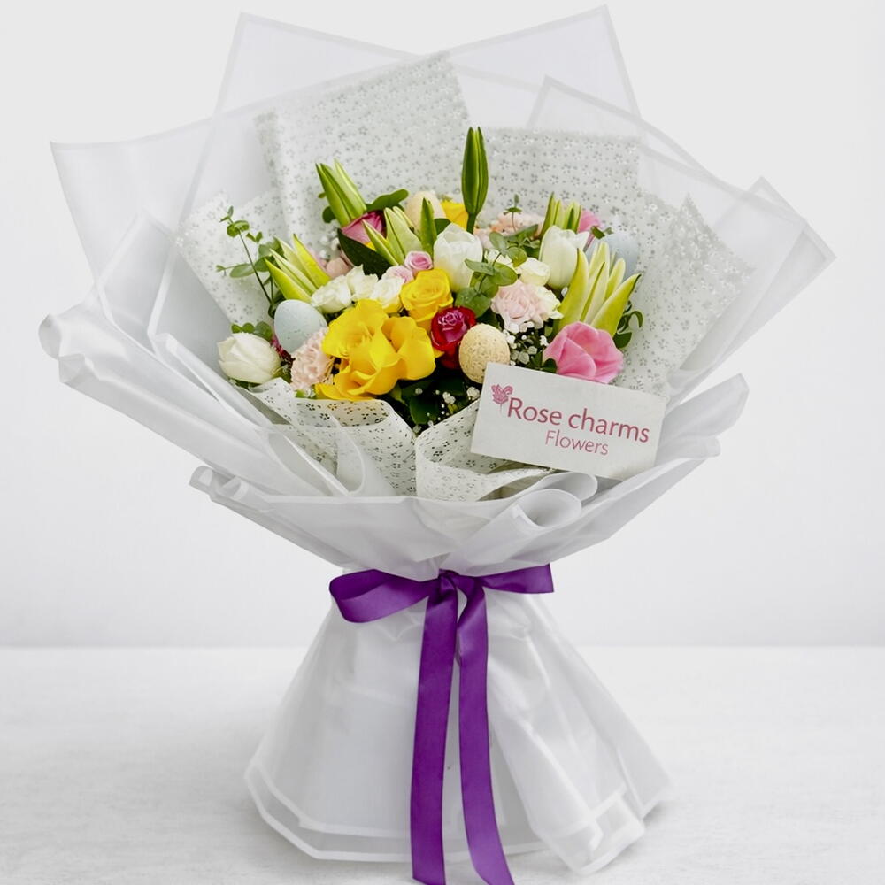 Отпразднуйте Пасху с нашим элегантным букетом ручной работы, в состав которого входят 2 белые лилии, 3 белых тюльпана, 3 розовых тюльпана, 4 фиолетовые розы, 4 желтые розы, 2 розовые кустовые розы, 2 белые кустовые розы, 4 розовые гвоздики, свежий эвкалипт, нежная гипсофила и 4 декоративных пасхальных яйца. Букет красиво упакован в высококачественную белую пленку с мягкой бумагой для роскошного весеннего завершения — идеально подходит для подарка, украшения дома или добавления праздничного настроения к вашему пасхальному торжеству. 🌸🐣✨