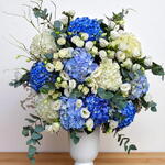 Насладитесь безмятежной красотой шести синих гортензий, четырёх белых гортензий, пяти белых кустовых роз и десяти белых лизиантусов, элегантно оформленных в стильном горшке с пышными зелёными наполнителями. Эта успокаивающая и изысканная композиция идеально подходит для создания нотки спокойствия и элегантности в любом помещении, идеально подходит для особых случаев или в качестве умиротворяющего элемента домашнего декора.