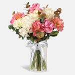 Elegant Ivory в вазе — изысканная цветочная композиция с нежно-розовыми розами и безупречно белыми гортензиями, прекрасно дополненная эвкалиптом золотистого оттенка. Идеально сбалансированная и изящно оформленная, эта роскошная композиция приносит вечную элегантность и очарование в любое пространство, что делает её идеальной для подарка, особых случаев или утончённых декоративных акцентов.
