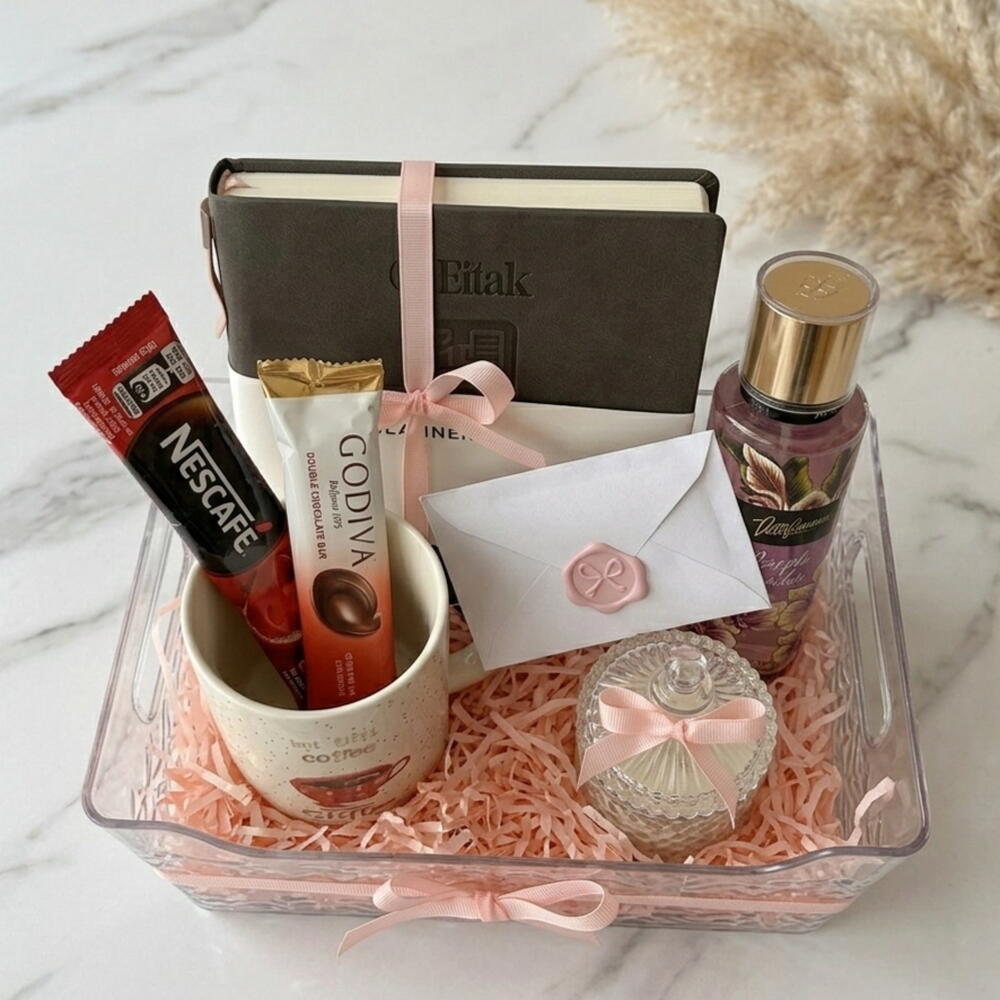 Идеальное сочетание стиля и умиротворения. В набор входит элегантный ежедневник, ароматическая свеча, духи, шоколад Godiva и кофе 2 в 1 для уютного начала. Идеальный подарок, чтобы вдохновить и побаловать особенного человека.