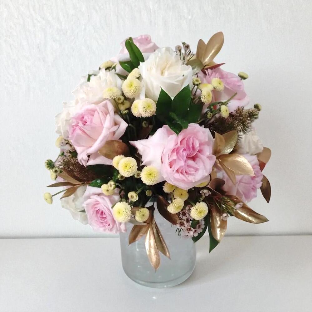 Элегантная пастельная роза — композиция в вазе с золотыми акцентами