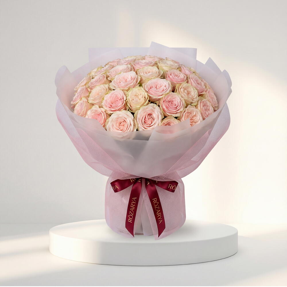 Роскошный букет премиальных нежно-розовых роз, элегантно упакованных в матовую бумагу с эффектом «frosted» и нежную розовую сетку. Завершён фирменной лентой Rozarya — идеально для любого милого повода. • Обратите внимание: поскольку цветы — натуральный продукт, реальные цвета могут незначительно отличаться от цифровых изображений из‑за сезонных особенностей роста и условий освещения. Мы гарантируем, что общий стиль, премиальное качество и свежесть вашей композиции всегда будут соблюдены.