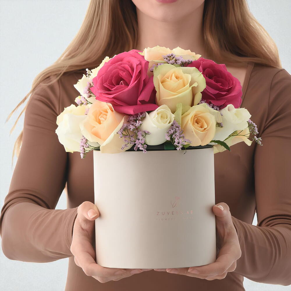 Отпразднуйте вечную любовь и трогательные моменты с помощью элегантной композиции «Медлей из роз» – цветочного подарка в песочной коробке. Эта изящная композиция представляет собой роскошное сочетание 3 темно-розовых роз, 8 белых роз и 8 персиковых роз, дополненное нежно-розовым лимониумом для придания фактуры и очарования. Этот изысканный цветочный дизайн, тщательно продуманный и оформленный в премиальной песочной коробке Zuvees, предлагает теплый и элегантный способ выразить привязанность, восхищение и искренние чувства.