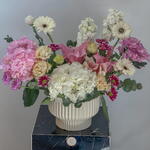 chrysanthemum pink - 1 шт. hydrangea pink - 1 шт. hydrangea white - 1 шт. white lisianthus - 2 шт. розовая лилия - 2 шт. белая гербера - 3 шт. маттиола белая - 2 шт. лизиантус персиковый - 2 шт. сантини красный спрей - 2 шт.