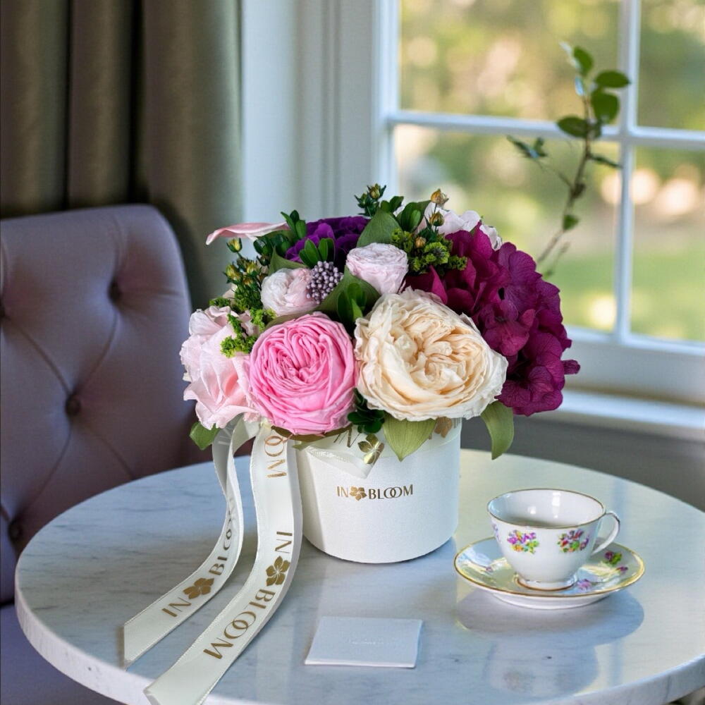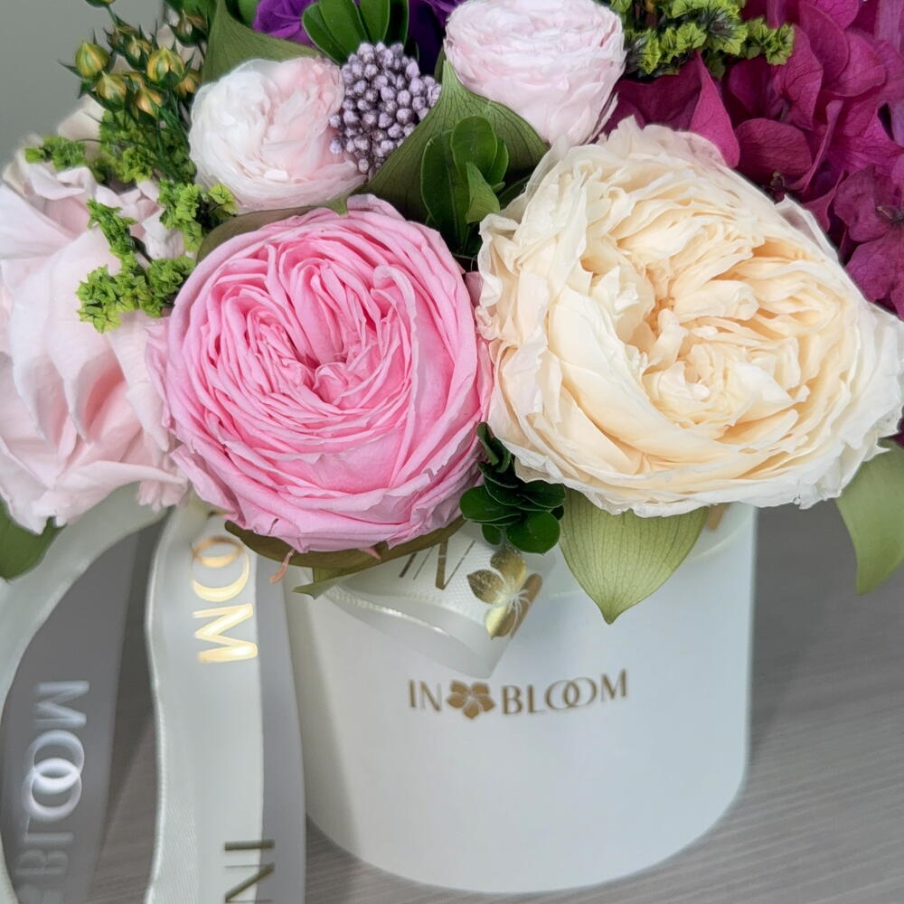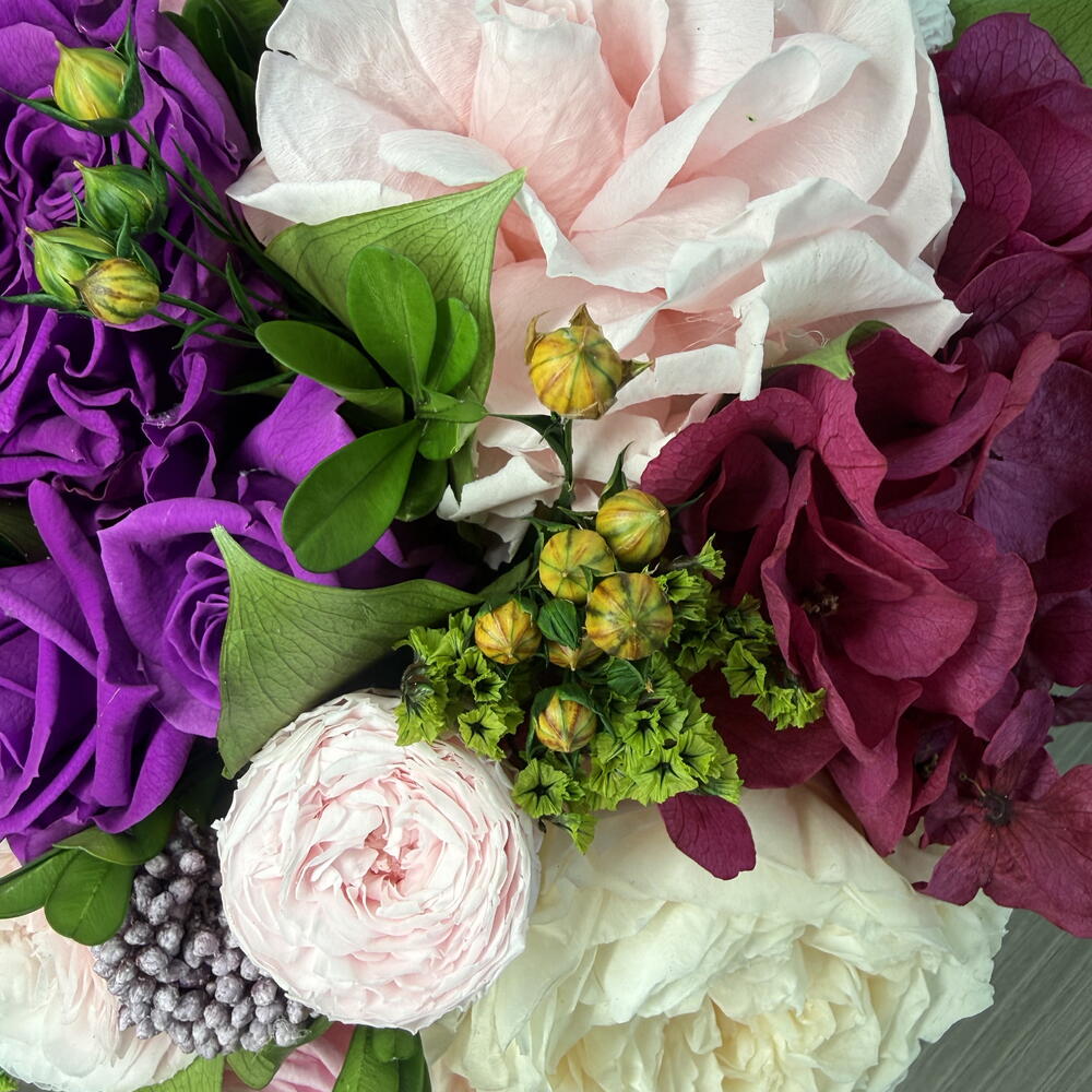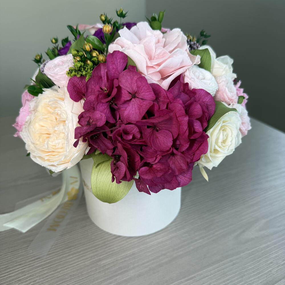 ✨ Премиальные живые цветы, которые сохраняют свежесть в течение года ✨ «Элис», наша миниатюрная цветочная композиция, представляет собой восхитительное сочетание биоконсервированных садовых и классических роз, гортензий и калл – идеальный подарок для различных случаев. Гарантированное долговременное счастье! Эта композиция изготовлена исключительно из 100% натуральных цветов, которые были биоконсервированы и сохраняют свежесть до одного года без полива и ухода. Обратите внимание, что каждая композиция создается нашими штатными флористами, поэтому возможны естественные вариации цвета, формы и состава.