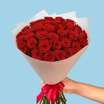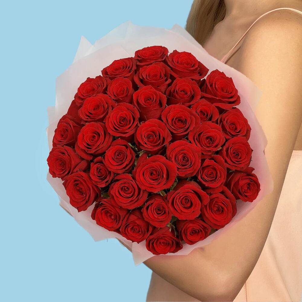Роскошный букет из 33 премиальных красных роз, источающий элегантность и страсть, идеально подходит для грандиозного романтического жеста.
