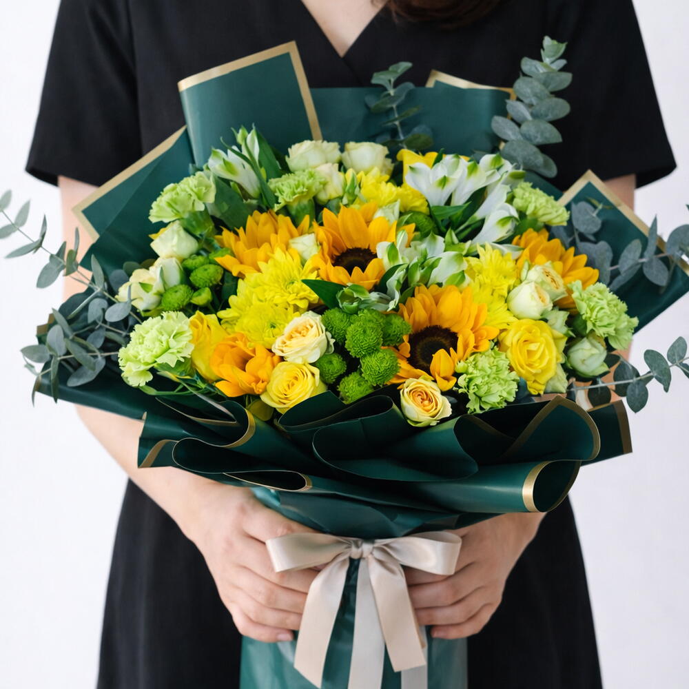 Богатый и жизнерадостный букет в теплых желтых тонах с элегантной зеленой упаковкой. Включает яркие подсолнухи, высококачественные желтые розы, свежие желтые хризантемы, стильные зеленые хризантемы-пуговки и нежно-зеленые гвоздики, дополненные белой альстромерией и роскошной зеленью эвкалипта. Идеальный выбор для поздравлений, новых начинаний, пожеланий скорейшего выздоровления или просто для поднятия настроения. Количество цветов: Подсолнухи: 5 стеблей Розы (желтые): 4 шт. Хризантемы (желтые): 4 стебля Хризантемы-пуговки (зеленые): 3 стебля Гвоздики (зеленые): 4 стебля Альстромерия (белая): 2 стебля Зелень эвкалипта: 4 стебля Примечание к заказу: Бесплатная печать поздравительной открытки включена в каждый заказ. (Пожалуйста, напишите текст для открытки при оформлении заказа.) Изменение цвета цветов: Вы можете изменить цвет цветов в соответствии с вашими предпочтениями. Это зависит от наличия цветов и может меняться в зависимости от ежедневного запаса. Дополнительные элементы: Вы можете добавить такие элементы, как: Воздушные шары, буквы, цифры, шоколад, духи и подарочные товары (по желанию). Гарантия свежести: Мы всегда используем свежие цветы и гарантируем наилучшее качество композиции.