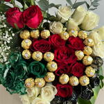 Red rose - 13 шт. White rose - 14 шт. black box - 1 шт. шоколад ferrero rocher - 22 шт. черная роза, окрашенная спреем - 5 шт. роза окрашенная в зелёный цвет - 8 шт.