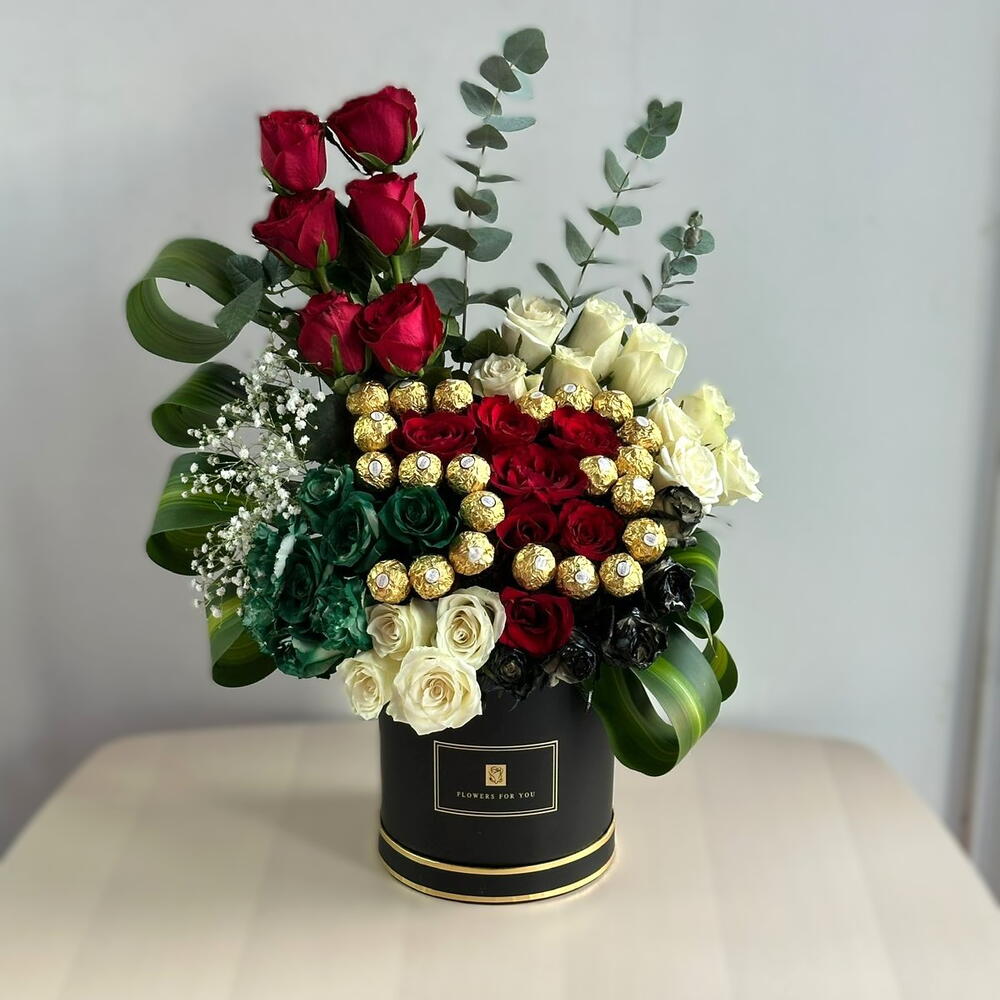 Red rose - 13 шт. White rose - 14 шт. black box - 1 шт. шоколад ferrero rocher - 22 шт. черная роза, окрашенная спреем - 5 шт. роза окрашенная в зелёный цвет - 8 шт.