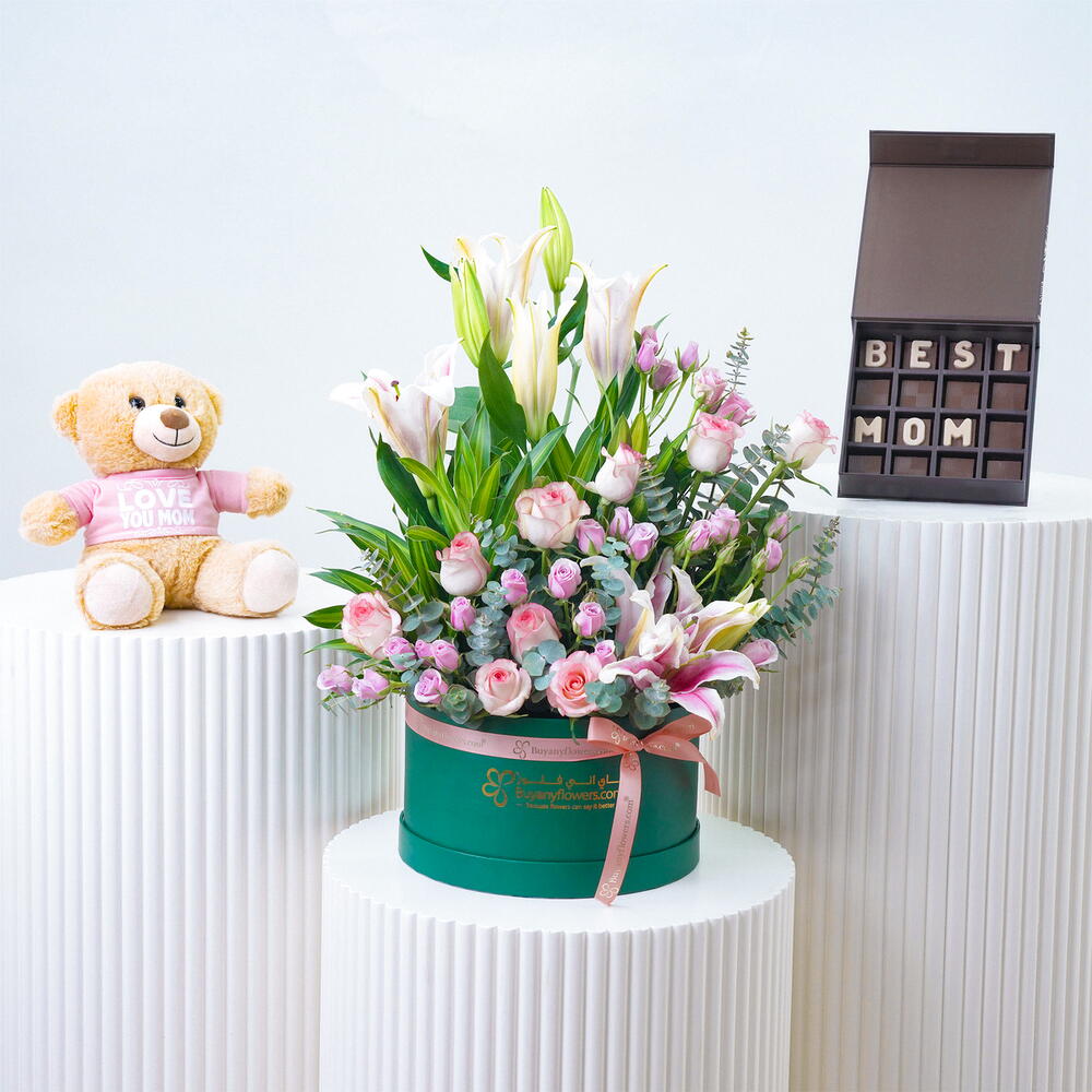 розовые восточные лилии - 3 шт. ветка эвкалипта - 1 шт. фиолетовые мини-розы - 5 шт. розы двух оттенков розового - 9 шт. стебли зелёной песни Ямайки - 4 шт. расположено в небольшой зелёной коробке (25 × 15 см) - 1 шт. завязано персиковой лентой - 1 шт. sweecho premium 16 шт шоколад лучшей маме - 1 шт. плюшевый мишка 25 см «люблю тебя, мама» - 1 шт.