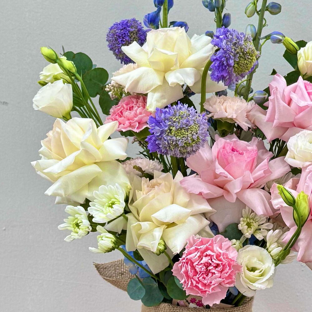 Произведите грандиозное впечатление с этой потрясающе роскошной и уникально структурированной композицией. Мы мастерски сочетали взмывающую вверх высоту голубых дельфиниумов и игривую, шаровидную текстуру фиолетовых аллиумов с бархатной, ароматной роскошью роз Охара нежно-розового оттенка. 🌸🩷 👀 Лучше всего подходит для: значимых дней рождения, корпоративных поздравлений, изысканных годовщин или благодарности, которая действительно возвышается. 🕊️🤍