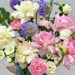 Eucalyptus - 5 шт. carnation pink - 5 шт. lisianthus white - 5 шт. delphinium - 3 шт. спрей-хризантема - 3 шт. ohara rose - 6 шт. алиум фиолетовый - 3 шт.