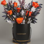 Окунитесь в мир таинственной элегантности с нашей коробочкой «Зачарованные тени» — цветочным шедевром, сочетающим в себе таинственность Хэллоуина и роскошный дизайн. Яркие оранжевые розы прекрасно смотрятся на фоне чёрной листвы, матово-белой кроны и тёмных извилистых ветвей, украшенных миниатюрными черепами. Композиция упакована в нашу фирменную чёрную шляпную коробку «Лаванда», украшенную золотой отделкой для придания ей нотки изысканности. Идеально подходит в качестве подарка на Хэллоуин, украшения для вечеринки или эффектного украшения интерьера.