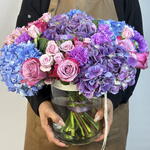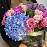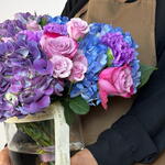 Погрузитесь в мир яркого чуда вместе с вазой «Зачарованный сумрак». Эта захватывающая композиция в вазе — завораживающая симфония насыщенных синих, королевских фиолетовых и игривых розовых оттенков, создающая по-настоящему волшебное зрелище. В ней — пышные, объёмные гортензии оттенков сапфира и аметиста, идеально переплетённые с романтичными садовыми розами и нежными спрей-розами; это произведение флористического искусства. Мастерски оформленная в стильной стеклянной вазе и завершённая нашей фирменной лентой, она является полным и незабываемым выражением красоты, роскоши и чистого очарования.