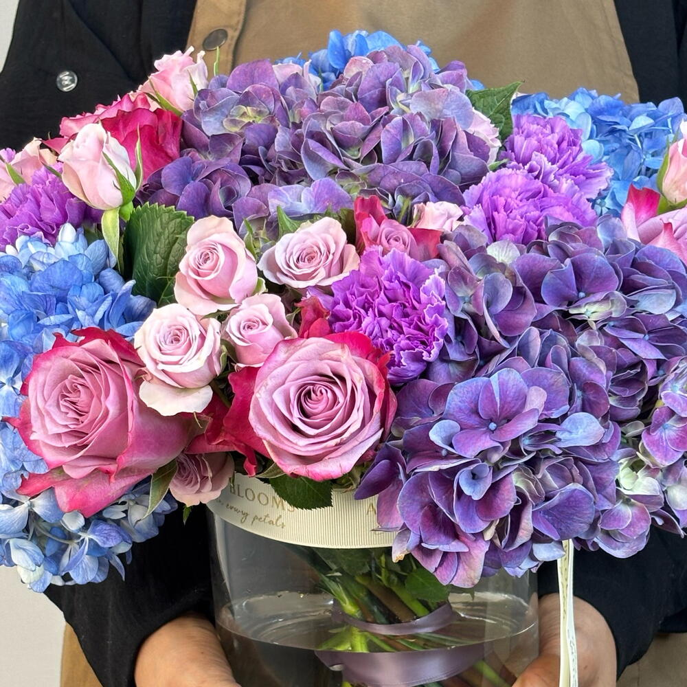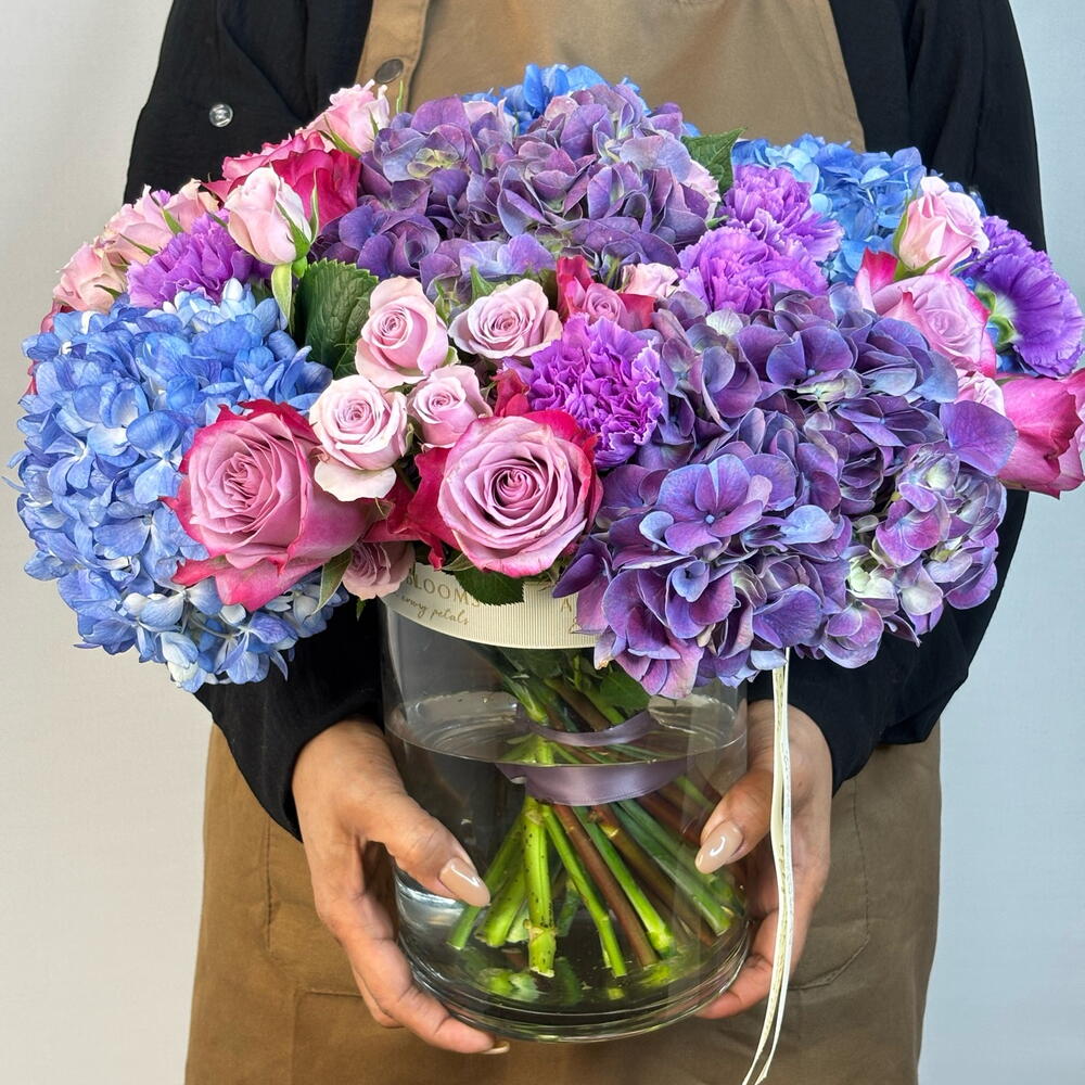 Погрузитесь в мир яркого чуда вместе с вазой «Зачарованный сумрак». Эта захватывающая композиция в вазе — завораживающая симфония насыщенных синих, королевских фиолетовых и игривых розовых оттенков, создающая по-настоящему волшебное зрелище. В ней — пышные, объёмные гортензии оттенков сапфира и аметиста, идеально переплетённые с романтичными садовыми розами и нежными спрей-розами; это произведение флористического искусства. Мастерски оформленная в стильной стеклянной вазе и завершённая нашей фирменной лентой, она является полным и незабываемым выражением красоты, роскоши и чистого очарования.