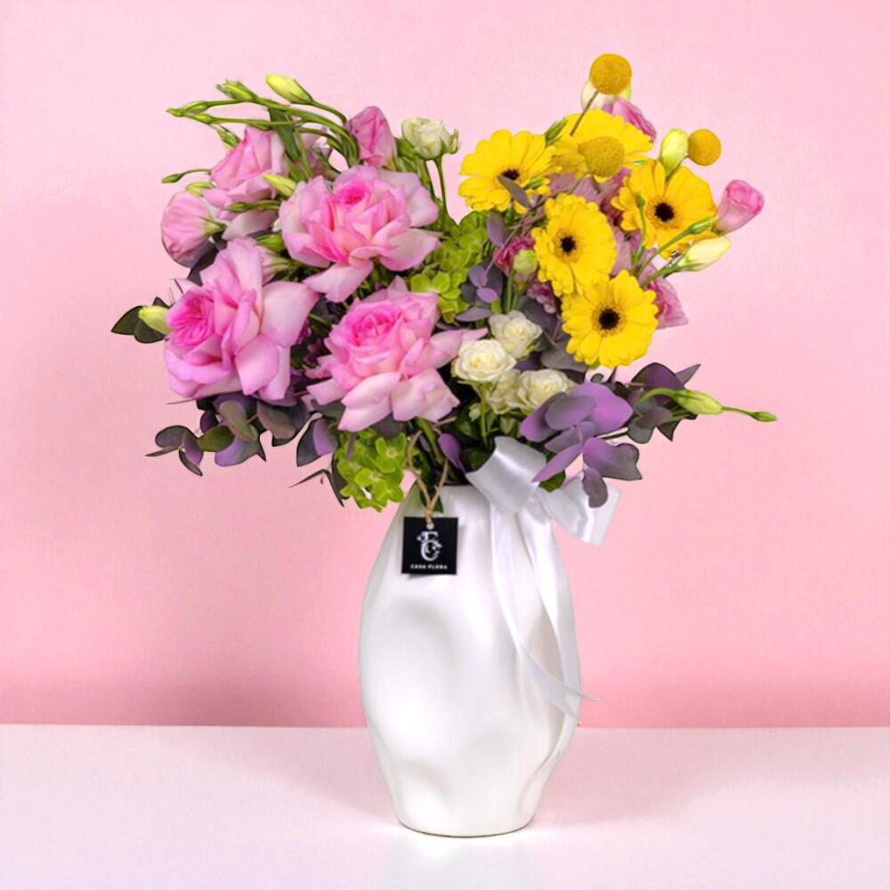 В изящной белой керамической вазе находится изысканная композиция из желтых гербер, розовых роз, зеленых гортензий, кустовых роз, белых лизиантусов и эвкалипта. Эта композиция сочетает в себе элегантность, текстуру и свежесть, создавая вневременную композицию.
