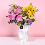 Pink rose - 5 шт. ceramic vase - 1 шт. lisianthus pink - 3 шт. желтая гербера - 5 шт.