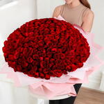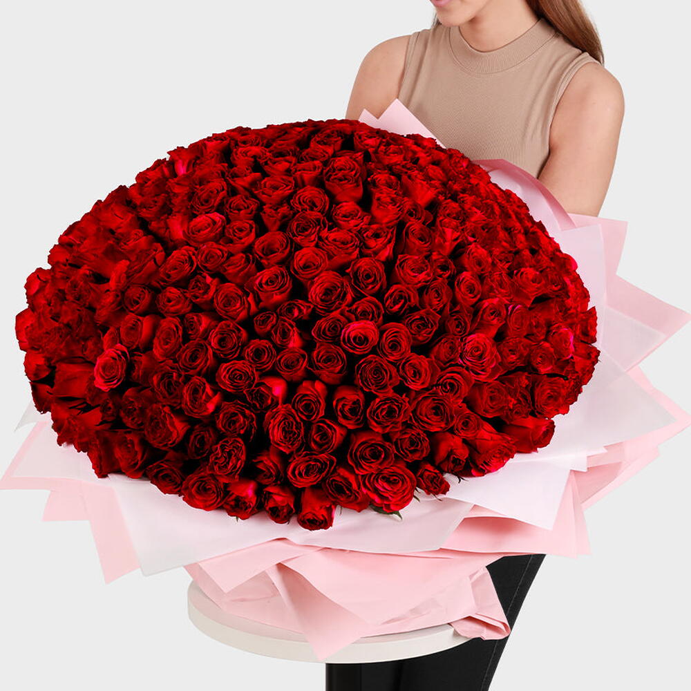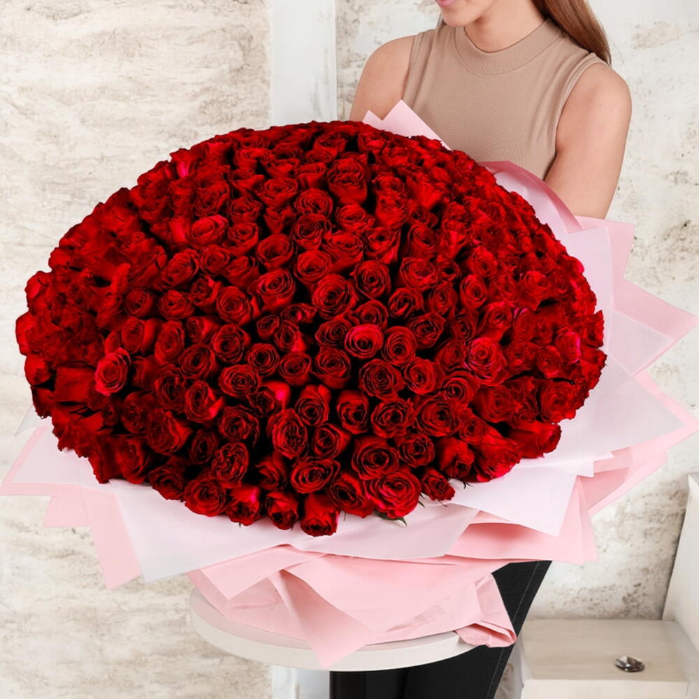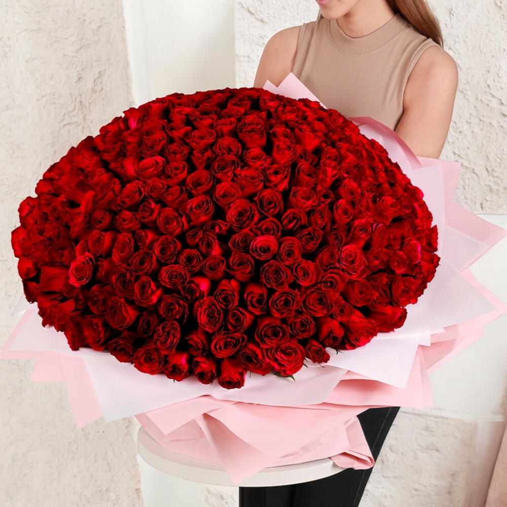 Тип цветов: свежие красные розы Количество: 300 красных роз Цвет: глубокий красный Упаковка: нежно-розовая и белая премиальная обёрточная бумага Стиль: круглая, пышная, полностью распустившаяся композиция Идеально для: годовщин, предложений руки и сердца, романтических подарков, особых торжеств Размер: очень большой, букет на всю руку