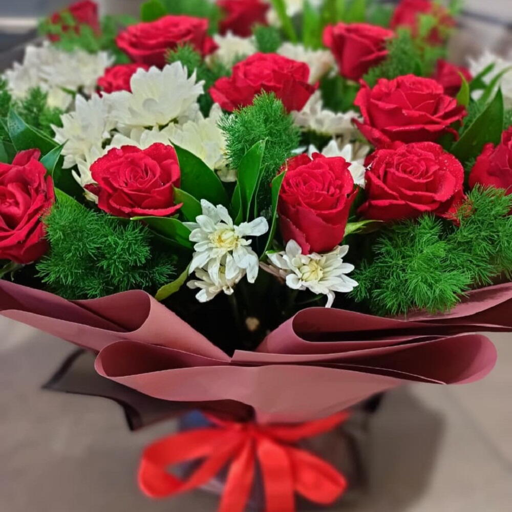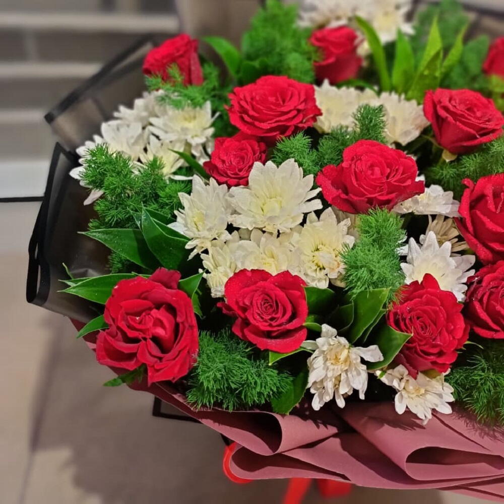 Поразительная классическая композиция ярких красных роз и свежих белых хризантем, идеально обрамлённая тёмной зеленью и завернутая в элегантные контрастные тона.