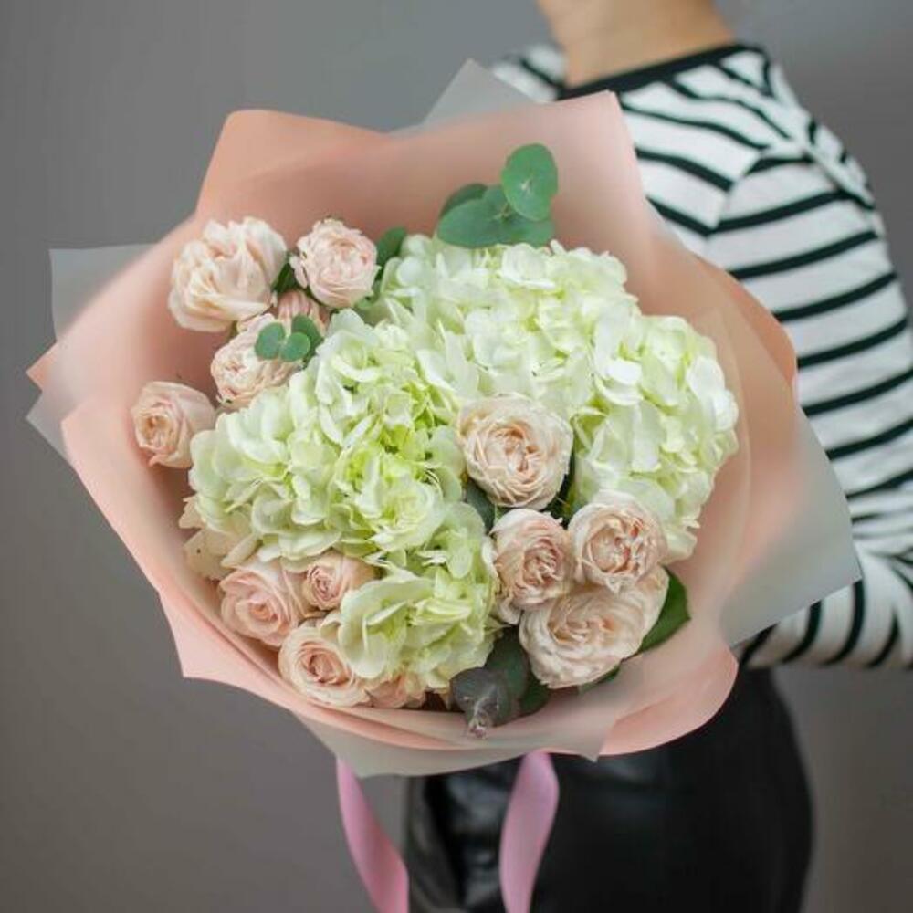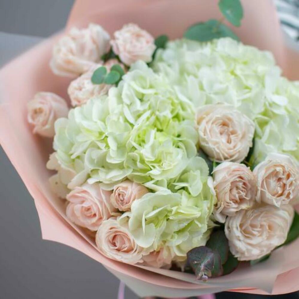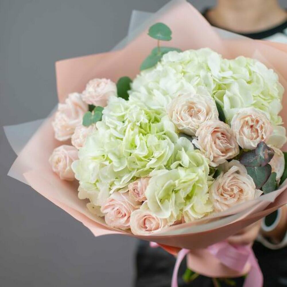 Eucalyptus - 1 шт. Hydrangea - 3 шт. дизайн упаковки - 1 шт. spray peony roses - 3 шт.