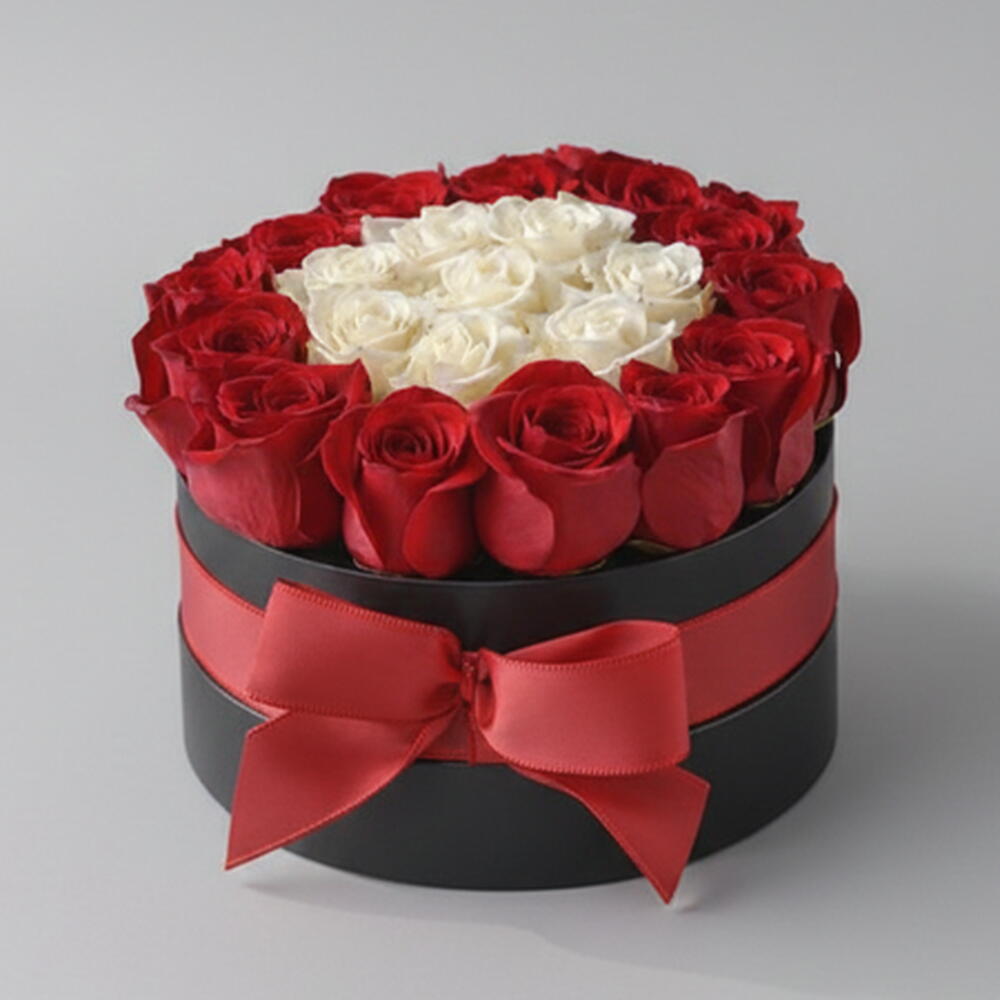 Корзина роз Круг вечной любви | 14 красных 8 белых роз | Доставка цветов ко Дню святого Валентина ОАЭ