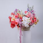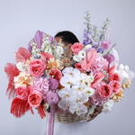 Eustoma - 10 шт. Hydrangea - 9 шт. Антуриум - 5 шт. matthiola - 5 шт. ribbon satin - 1 шт. peach rose - 25 шт. feather - 8 шт. delphinium - 3 шт. oxypetalum blue - 5 шт. palm leaves - 1 шт. eucalyptus leaves - 8 шт. хвостик кролика - 15 шт. деревянная корзина - 1 шт. орхидея фаленопсис белая - 1 шт. садовые розы pink expression - 10 шт. хризантема mimoko - 5 шт.