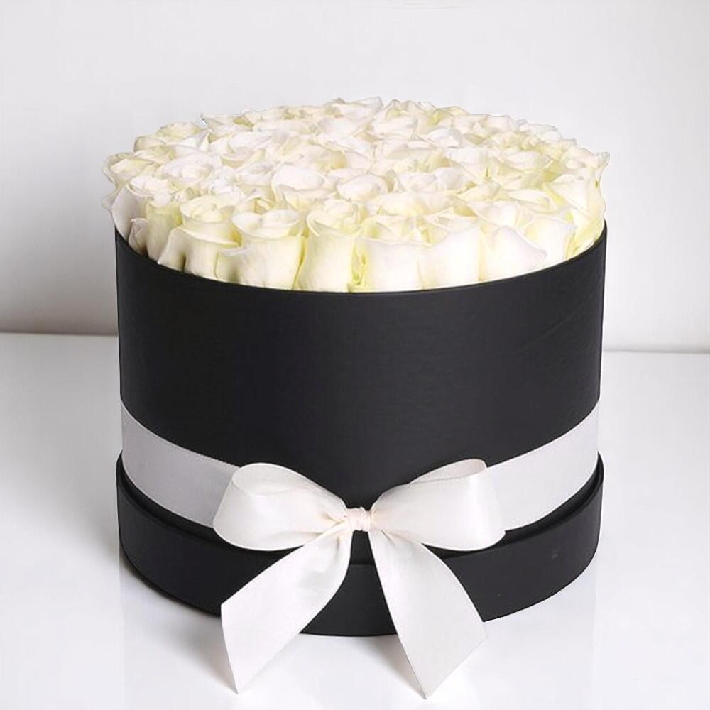 Вневременная элегантность сочетается с минималистичным дизайном в этой роскошной шляпной коробке с чисто белыми розами. Размещённая в изящной чёрной коробке и завершённая аккуратной белой атласной лентой, эта композиция является утончённым подарком на свадьбы, годовщины, в знак соболезнования или как выражение чистого восхищения. Чистая цветовая палитра и структурированный дизайн излучают достоинство и утончённость. Чтобы сохранить свежесть, ежедневно проверяйте флористическую пену внутри коробки и при необходимости добавляйте чистую воду. Выставляйте в прохладном месте, вдали от прямых солнечных лучей и источников тепла.
