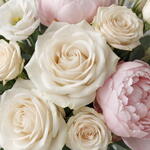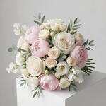 Нежный и вневременный свадебный букет в пудрово-розовых и оттенках слоновой кости, оформленный элегантными розами, нежными пионами и воздушными сезонными акцентами. Романтичный, изысканный и гармонично сбалансированный, этот дизайн идеально подходит для свадеб, помолвочных торжеств и в качестве элегантного роскошного подарка.