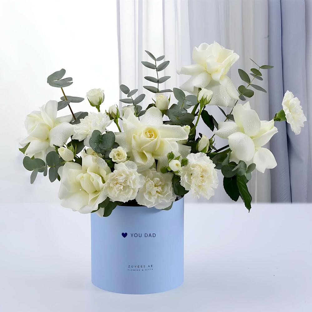 Эта элегантная цветочная коробка, сочетающая в себе умиротворяющее сочетание белых цветов и пышной зелени, символизирует уважение, восхищение и непреходящую любовь. Она создана, чтобы выразить благодарность и отметить присутствие отца, направляющего вас, и станет душевным способом сказать «спасибо» в этот День отца.