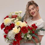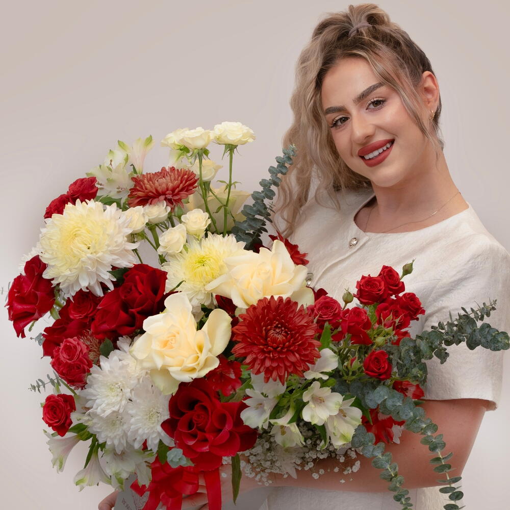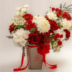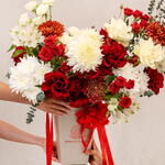 Red rose - 10 шт. Eucalyptus - 2 шт. Alstroemeria - 6 шт. White rose - 4 шт. Gypsophila - 4 шт. white spray rose - 3 шт. red spray rose - 4 шт. спрей-хризантемы - 4 шт. фирменная коробка - 1 шт. хризантемы с удалёнными боковыми бутонами - 6 шт.