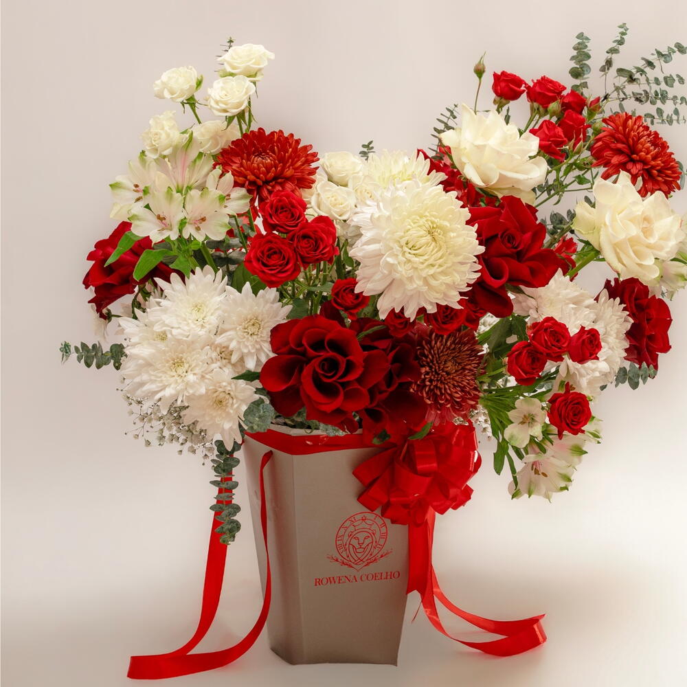 A romantic flower bag box arrangement featuring classic red roses, soft ivory roses, elegant disbud chrysanthemums, and seasonal blooms, finished with fresh greenery and a beautiful red ribbon. Because love isn’t loud. It’s thoughtful. And it arrives before she even has to ask.