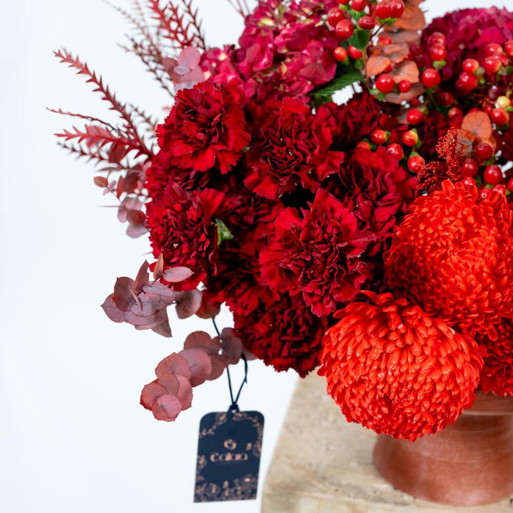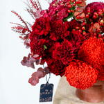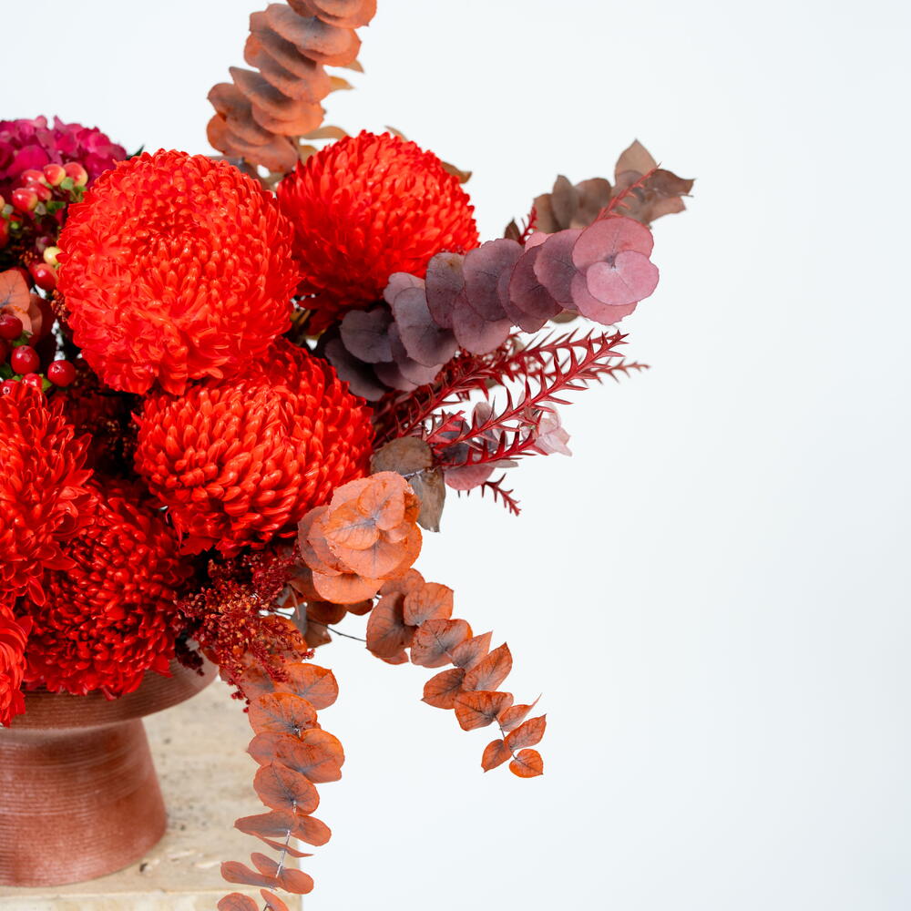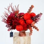 гиперикум красный - 8 шт. бордовая гвоздика - 17 шт. осенний эвкалипт - 7 шт. gravilla ivan hoe с красным оттенком - 2 шт. деко тонированное красным - 9 шт.
