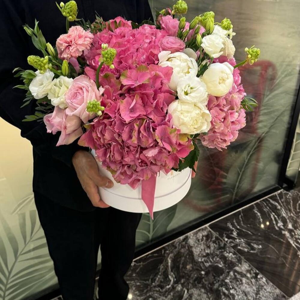 Composition: Hydrangea mix - 5, Peony import white - 3, Lisianthus - 5, Ornithogalum - 10, Dianthus mix - 1, Rose Pink Ohara - 5, Branded round box - 1 Sizes: WIDTH - 30CM; HEIGHT - 30CM; LENGTH - 30CM; (including packaging) Размер: 30 x 30 x 30 см