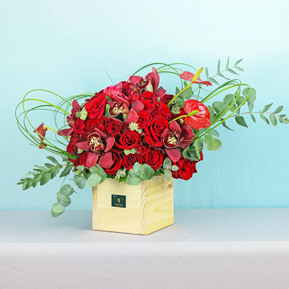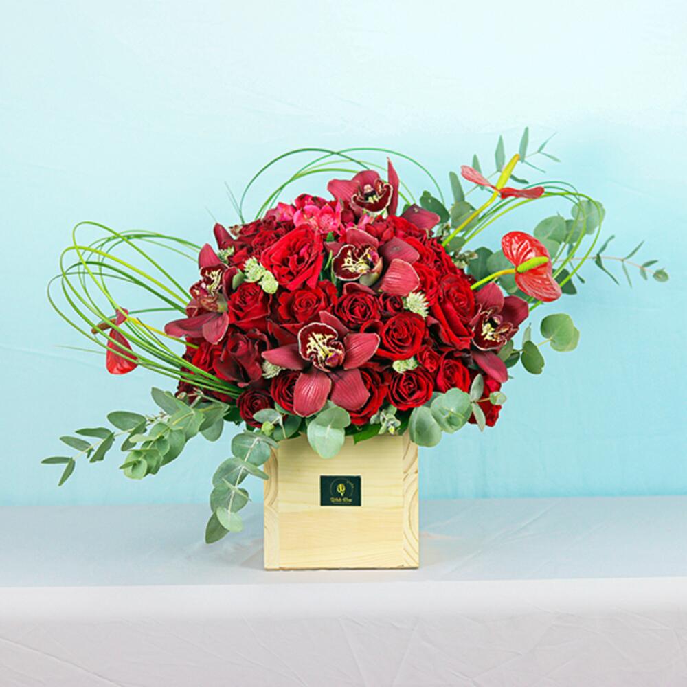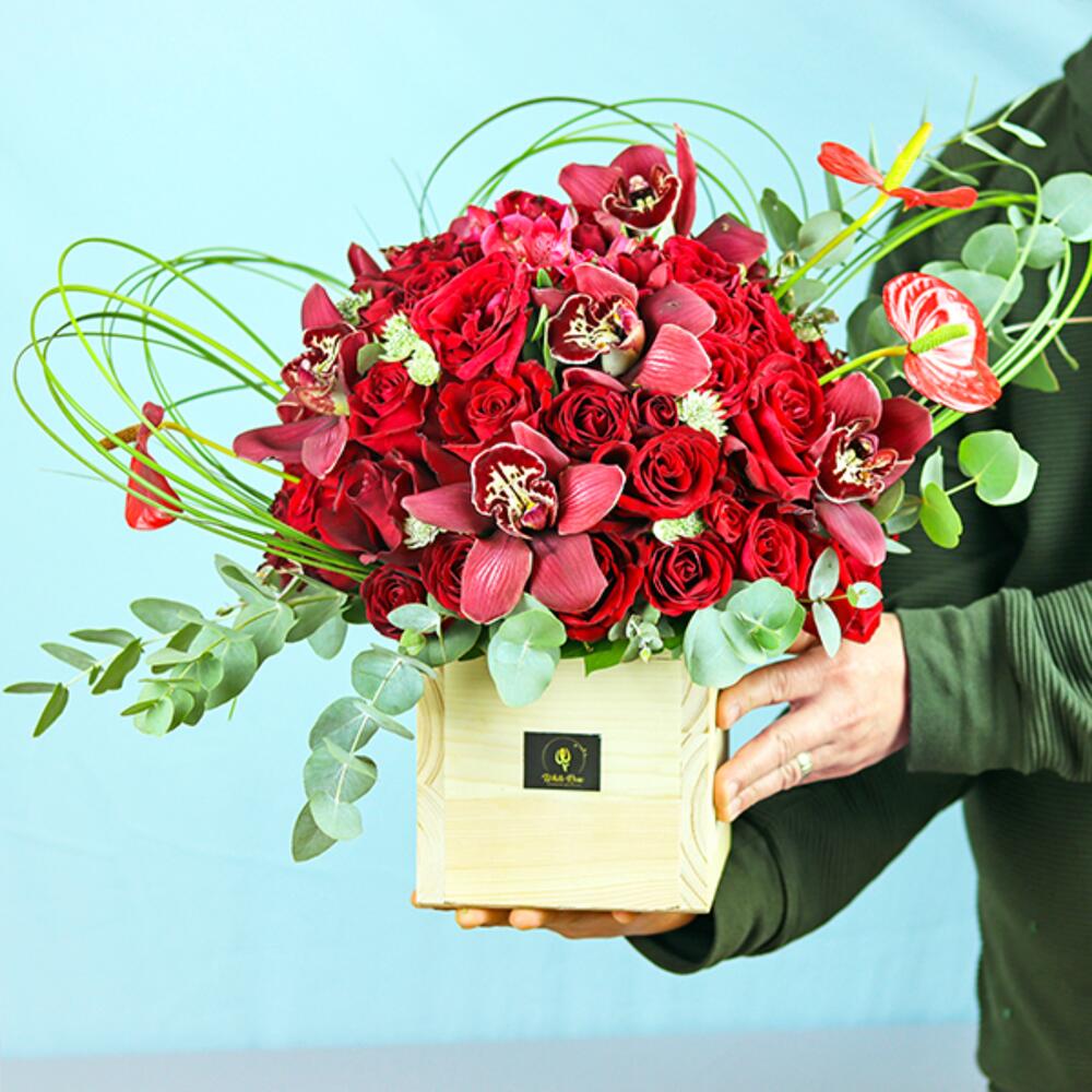 Комбинация из красных роз, мини-роз, орхидей и других цветов в деревянной коробке
