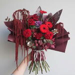 Этот смелый и художественный букет представляет собой драматичную композицию глубоких красных и бордовых тонов, создающую роскошную и выразительную цветочную аранжировку. Букет сочетает насыщенные красные розы и герберы с фактурными декоративными элементами, ниспадающим амарантом и элегантной зеленью, всё завернуто в премиальную бордовую упаковку. Его поразительная палитра цветов и скульптурный дизайн делают его идеальным выбором для юбилеев, романтических жестов, художественных подарков или эффектных случаев. Эта композиция идеально подходит для тех, кто ценит современную флористику с сильным визуальным эффектом. Чтобы сохранить свежесть, поместите букет в чистую воду сразу после распаковки и держите его вдали от прямых солнечных лучей и источников тепла.