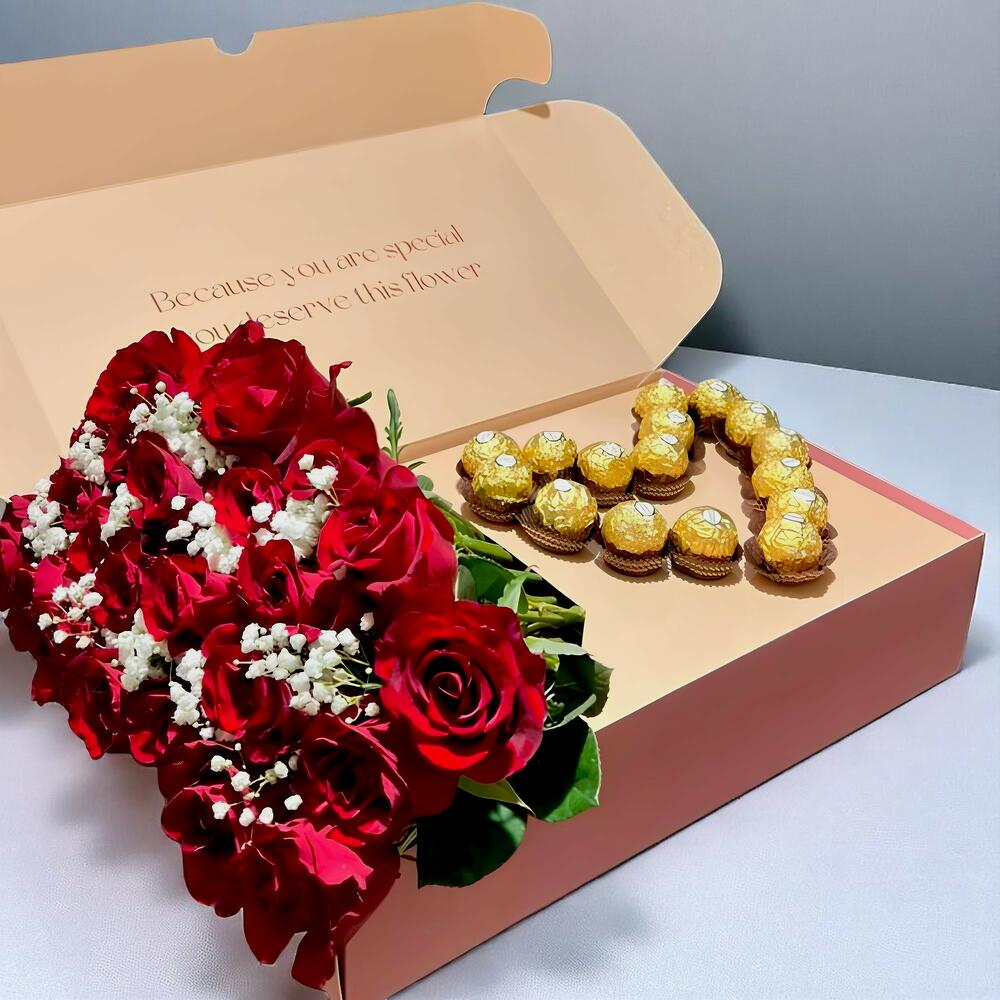 Sweet Devotion — роскошный подарочный набор, который передаёт суть романтики и тепла. В букете — бархатистые красные розы, украшенные нежной гипсофилой; он излучает страсть и нежность. В комплекте — золотое сердце из конфет Ferrero Rocher; это идеальный выбор для годовщин, дней рождения или просто чтобы выразить любовь самым сладким способом.