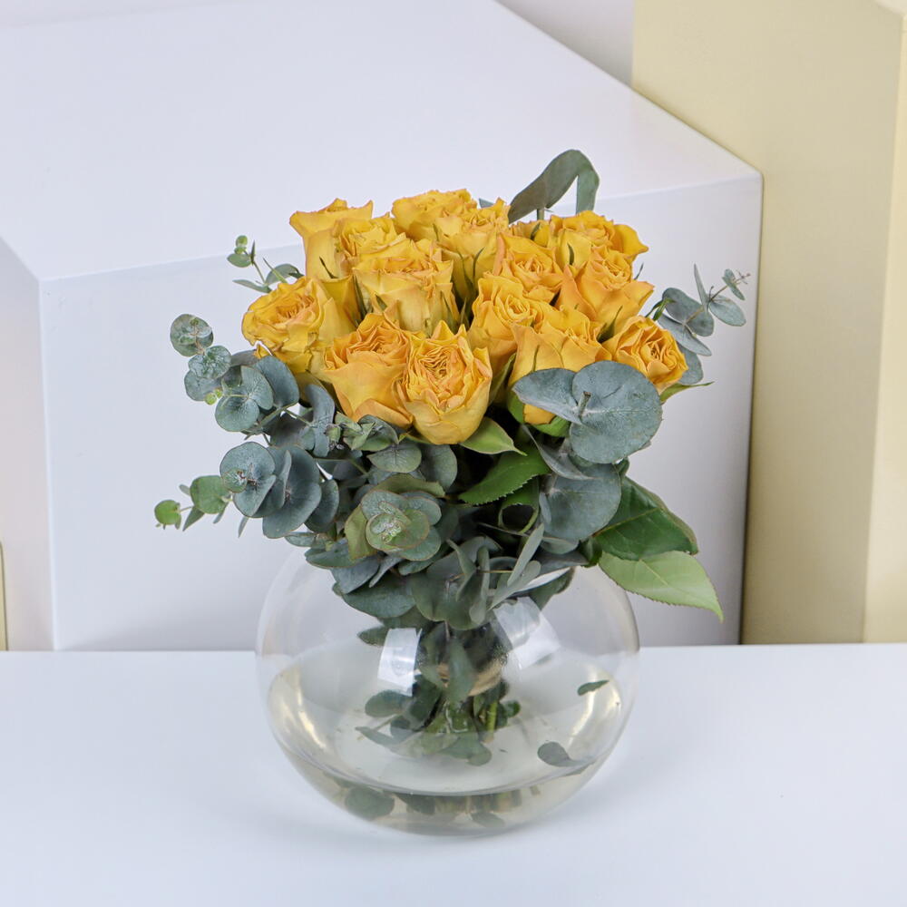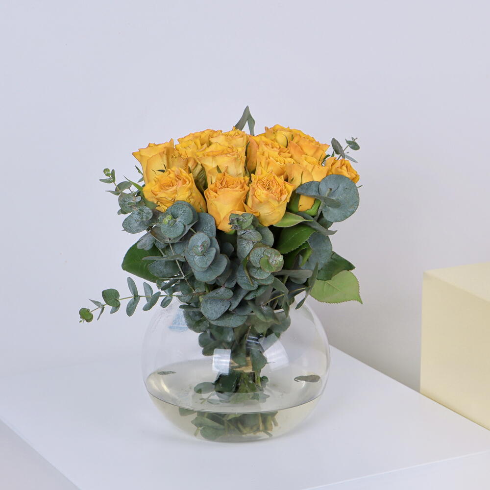 20 желтых роз внутри шара, наполненного водой, прекрасная композиция