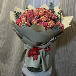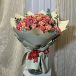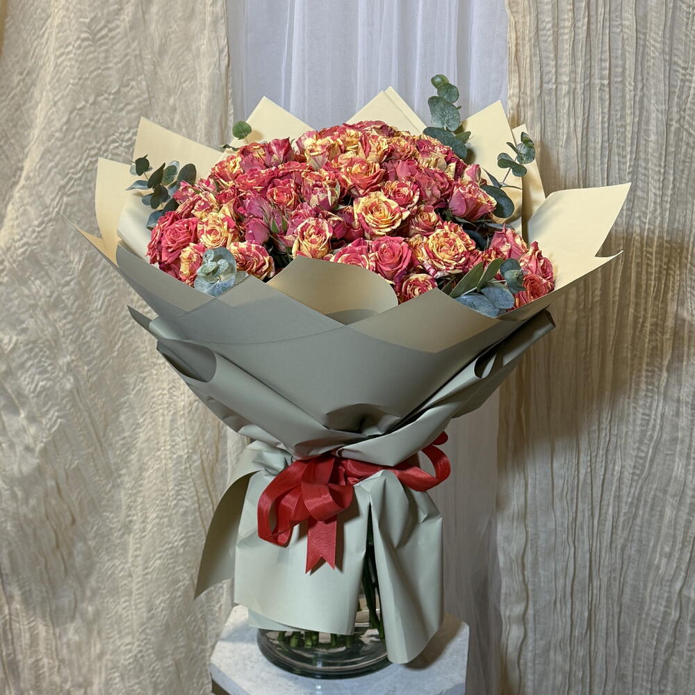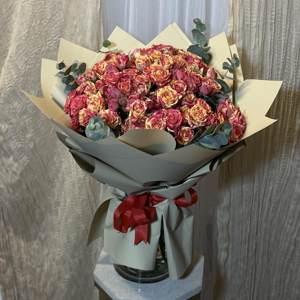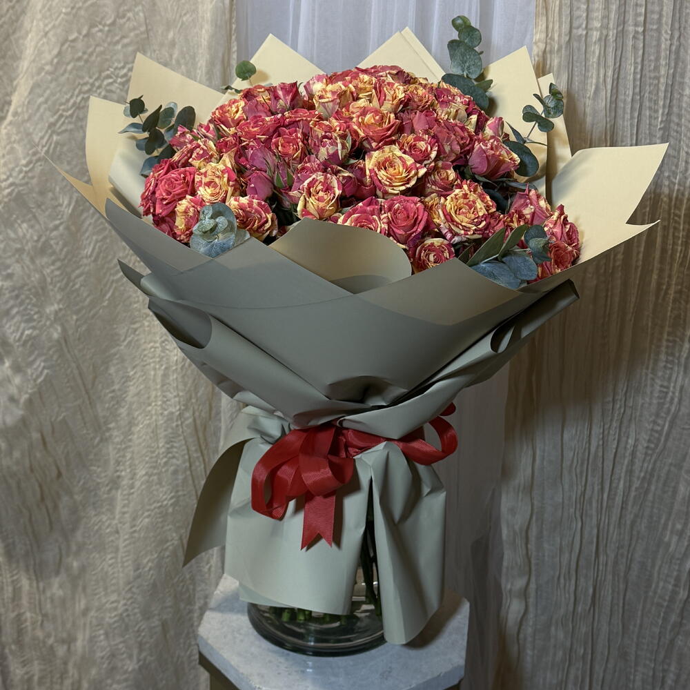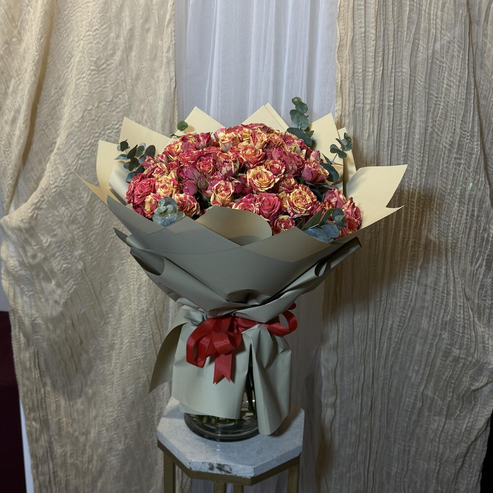 Отправьтесь в путешествие визуального наслаждения с нашим монобукетом, креативно составленным из 20 потрясающих кустовых роз «Фейерверк». Благодаря своему яркому цвету и цветению эти розы составляют сердце композиции. Их великолепие дополняют 7 тщательно подобранных дополнительных элементов, включая листья и другие яркие цветочные элементы, искусно разбросанные, чтобы подчеркнуть естественное очарование и причудливость. Этот букет – гармоничное сочетание красоты и элегантности, идеальное выражение восхищения и чувств для любого случая.