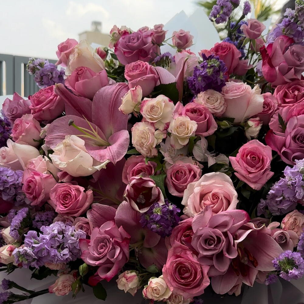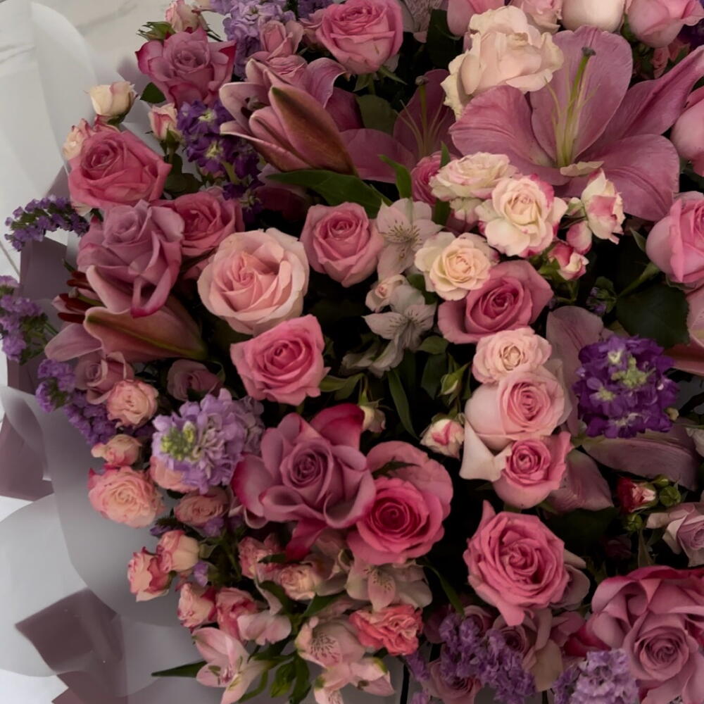 Statice - 10 шт. Alstroemeria - 4 шт. Lily - 3 шт. rose - 20 шт. matthiola - 5 шт. бэби роуз - 8 шт.