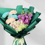 Яркая и изысканная композиция, впечатляющая цветом, текстурой и современной элегантностью. Этот букет состоит из 2 белоснежных гортензий, 5 лилий, 5 розовых дельфиниумов и по 3 синих и розовых хризантем. Все они искусно расположены и упакованы в изумрудно-зелёную бумагу для создания роскошной, изысканной композиции. Пышные белые гортензии придают букету пышность, а лилии – изящество и изысканность. Розовые дельфиниумы и разноцветные хризантемы привносят игривый контраст, глубину и визуальный интерес. Изумрудно-зелёная упаковка усиливает цвета, создавая эффектный и гармоничный общий вид. Идеально подходит для дней рождения, юбилеев, поздравлений или в качестве подарка тому, кто ценит изысканные, фотогеничные и тщательно подобранные цветочные композиции. Этот букет идеально подойдёт как для него, так и для неё: смелый, современный и непринуждённо роскошный – воплощение элегантности и цвета.