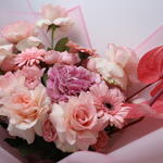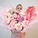 Pink rose - 7 шт. pink Gerbera - 3 шт. pink hydrangeas - 1 шт. anthuriums - 2 шт. садовая роза Бомбастик - 3 шт.