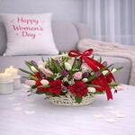 Basket - 1 шт. wax - 1 шт. pink tulips - 12 шт. red carnations - 12 шт. white tulips - 11 шт. фиолетовые тюльпаны - 12 шт.