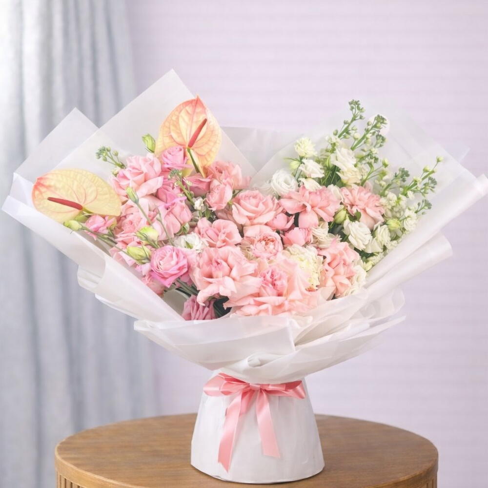 Антуриум - 2 шт. hydrangea white - 1 шт. lisianthus white - 5 шт. lisianthus pink - 5 шт. пинк охара - 10 шт. маттиола белая - 10 шт. джульетта персик - 5 шт.